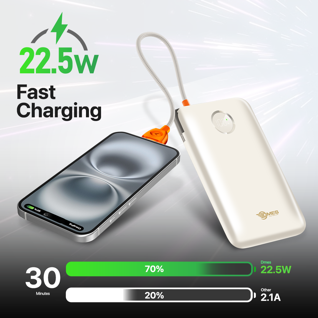 Supports up to 22.5W output via built-in cable and 20W PD fast charging via Type-C port — efficient and reliable power delivery.
