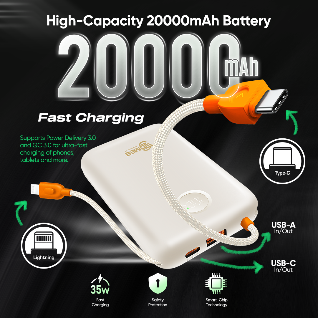With a 20,000mAh (77Wh) capacity, enjoy multiple full charges for your devices — perfect for travel, daily commutes, and emergencies.