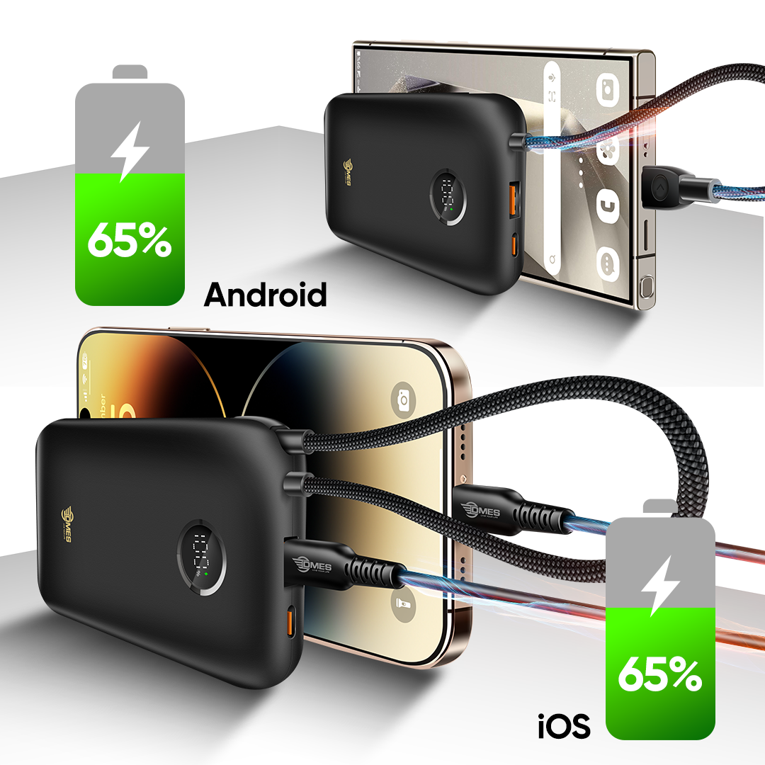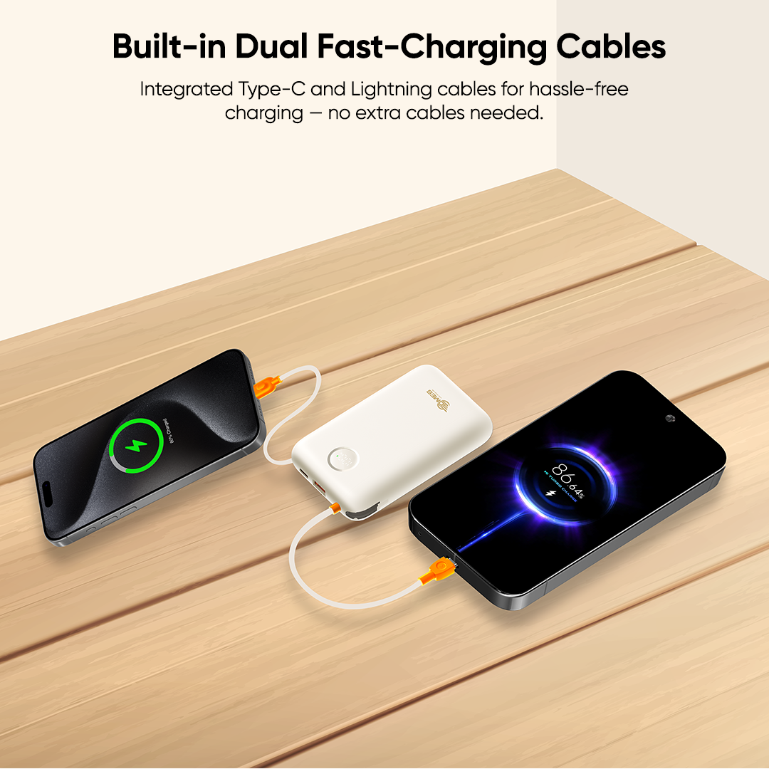 Charge two devices simultaneously via USB-A and built-in cable (Type-C or Lightning).